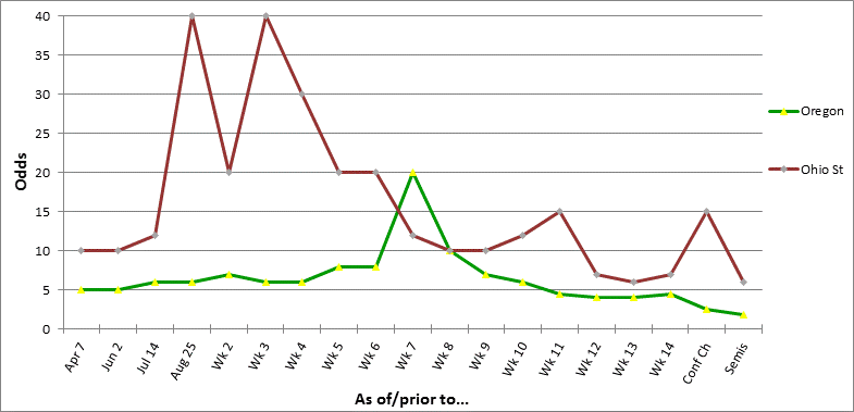 New England opened at +700 and closed at +650 just prior to the start of the season. After their 41-14 loss to Kansas City their odds went up to +1400. The Patriots then went on an 8-game winning streak and were the co-favorites (with Green Bay) prior to week 13. .