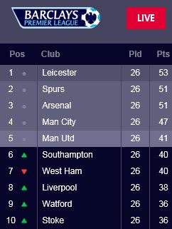 Leicester, who was 5,000-1 prior to the start of the season, is currently two points clear of Arsenal and Spurs. After losing to Spurs on February 14 Manchester City is currently in fourth place and six points back.