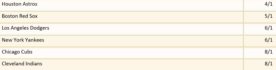 At 5/1 the Red Sox must be considered a great bet. The Astros are also a great bet and they are playing great baseball as well. The Dodgers? Big question mark on the pitching down the stretch but they are not chopped liver either. The Dodgers have done an amazing job of turning their season around. Last year was stellar for LA but the beginning of this season was an unmitigated disaster. Baseball is a funny game, and anything can happen, however, the Red Sox look like they were built for the long haul. Check with your favorite bookie service and find out what their numbers are and jump on this future bet.